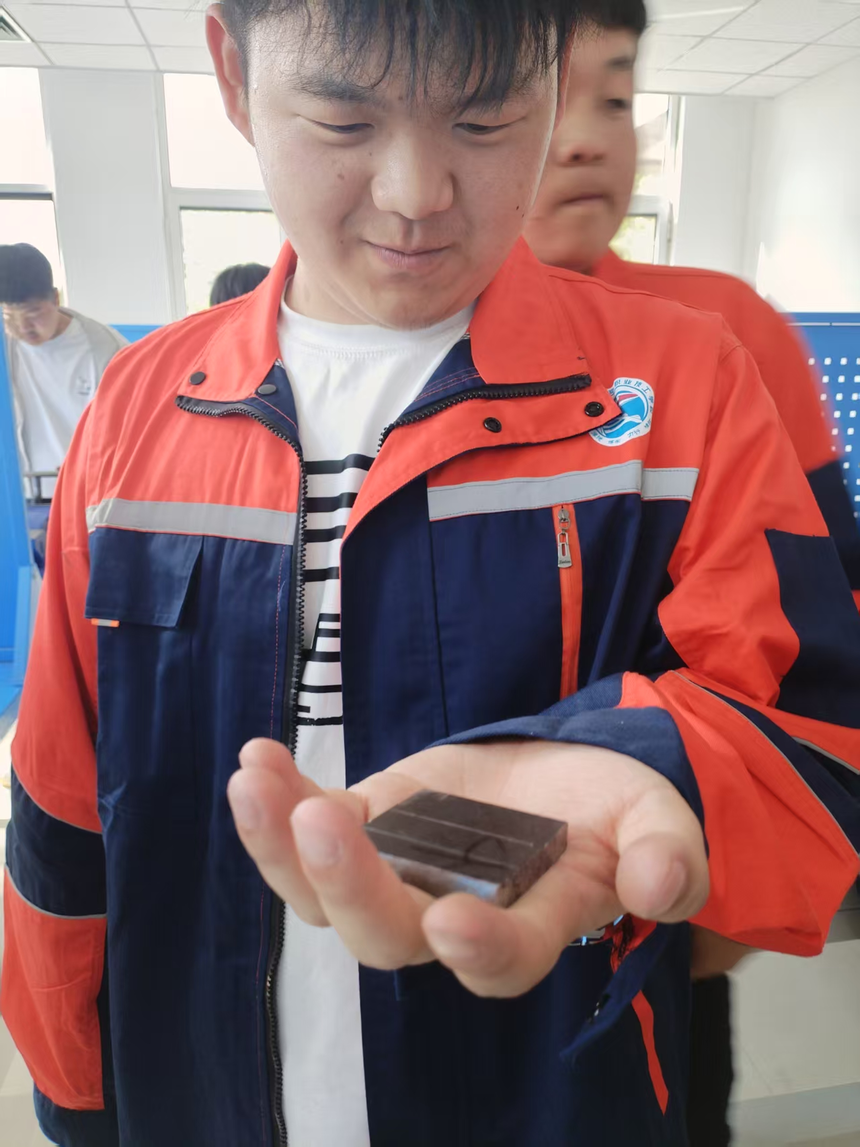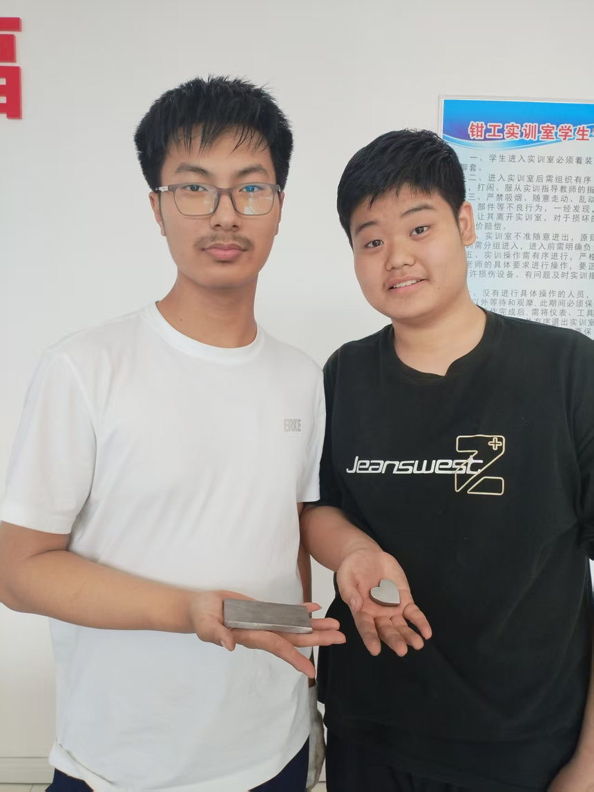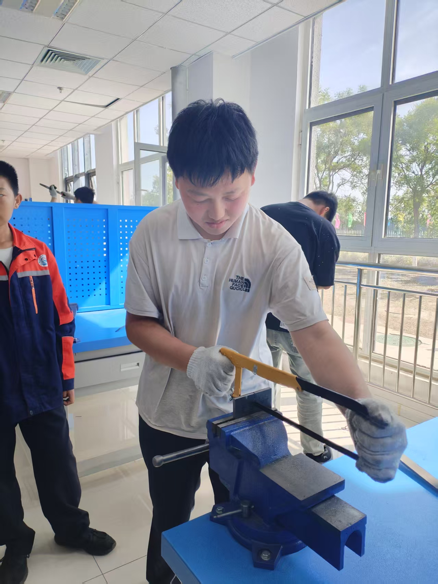 在上述图片中,我们可以看到学生在教师的指导下进行学习,主要教学内容为:钳工正方块加工需先选料,粗锉两面保证平面度,用角尺检查垂直度,根据尺寸要求锯割毛坯,留加工余量,确保相邻面垂直。然后精锉另两面,用游标卡尺控制尺寸精度,使各边尺寸一致,表面粗糙度达标。最后研磨边角去毛刺,保证正方块棱角分明、尺寸精准,整个过程需耐心与技巧,注重测量和修整。